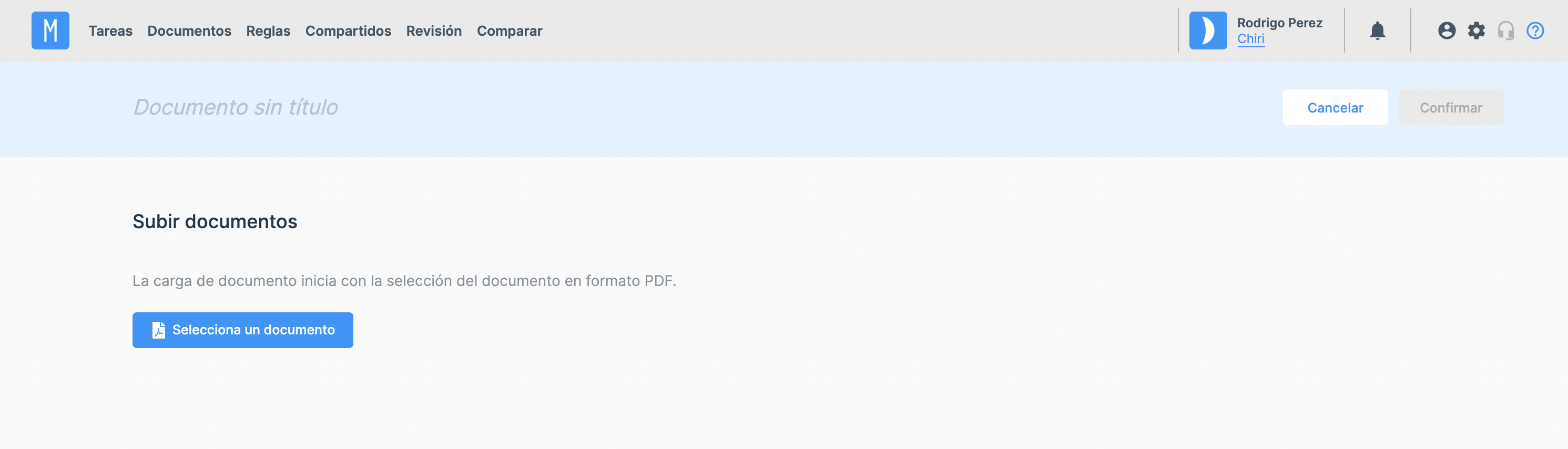 La funcionalidad de subir documentos está disponible sólo para usuarios administradores, y debe ser activada en la configuración del espacio de trabajo.